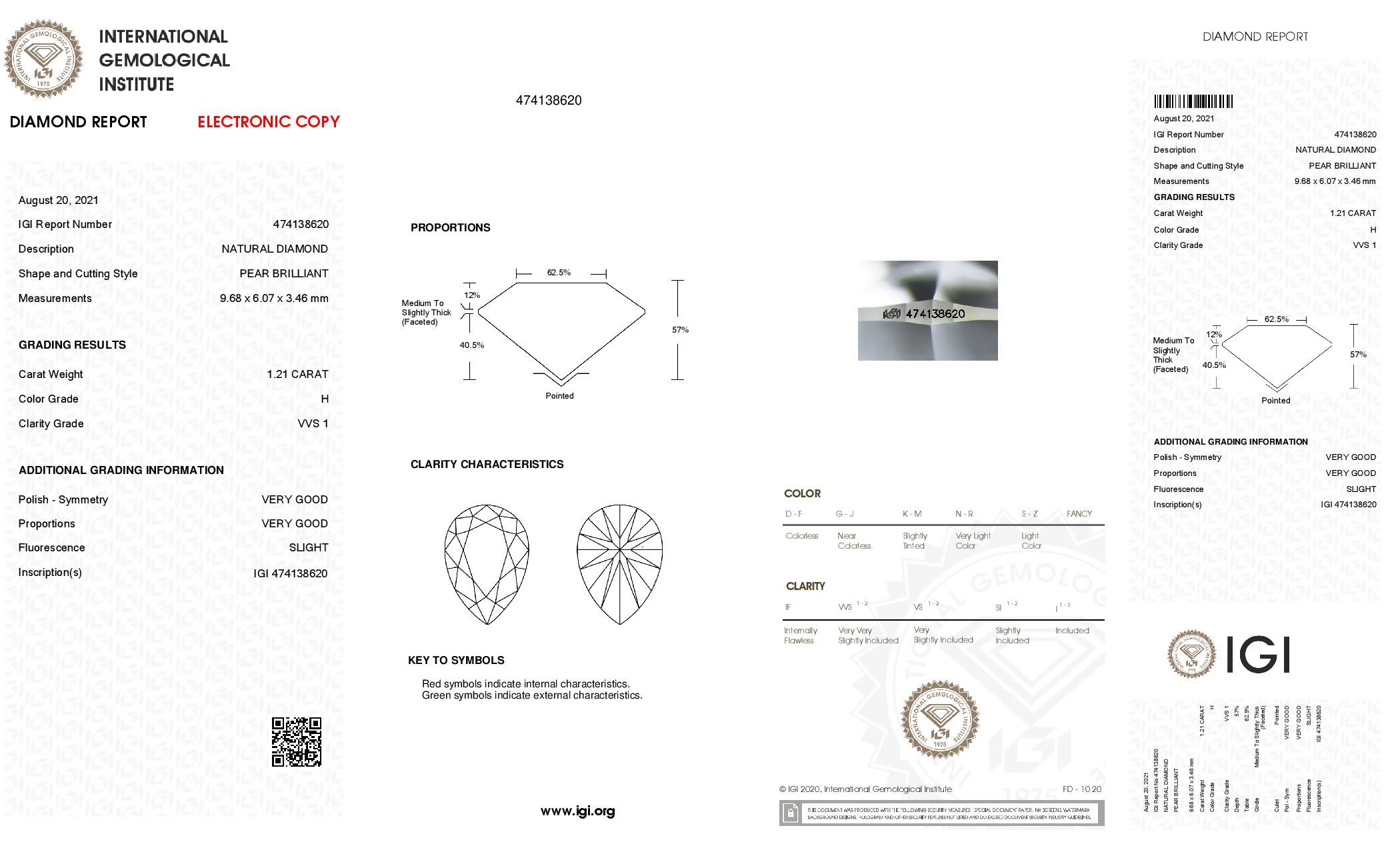 Prírodný diamant hruška, VVS1, H, 1.21ct, s certifikátom IGI