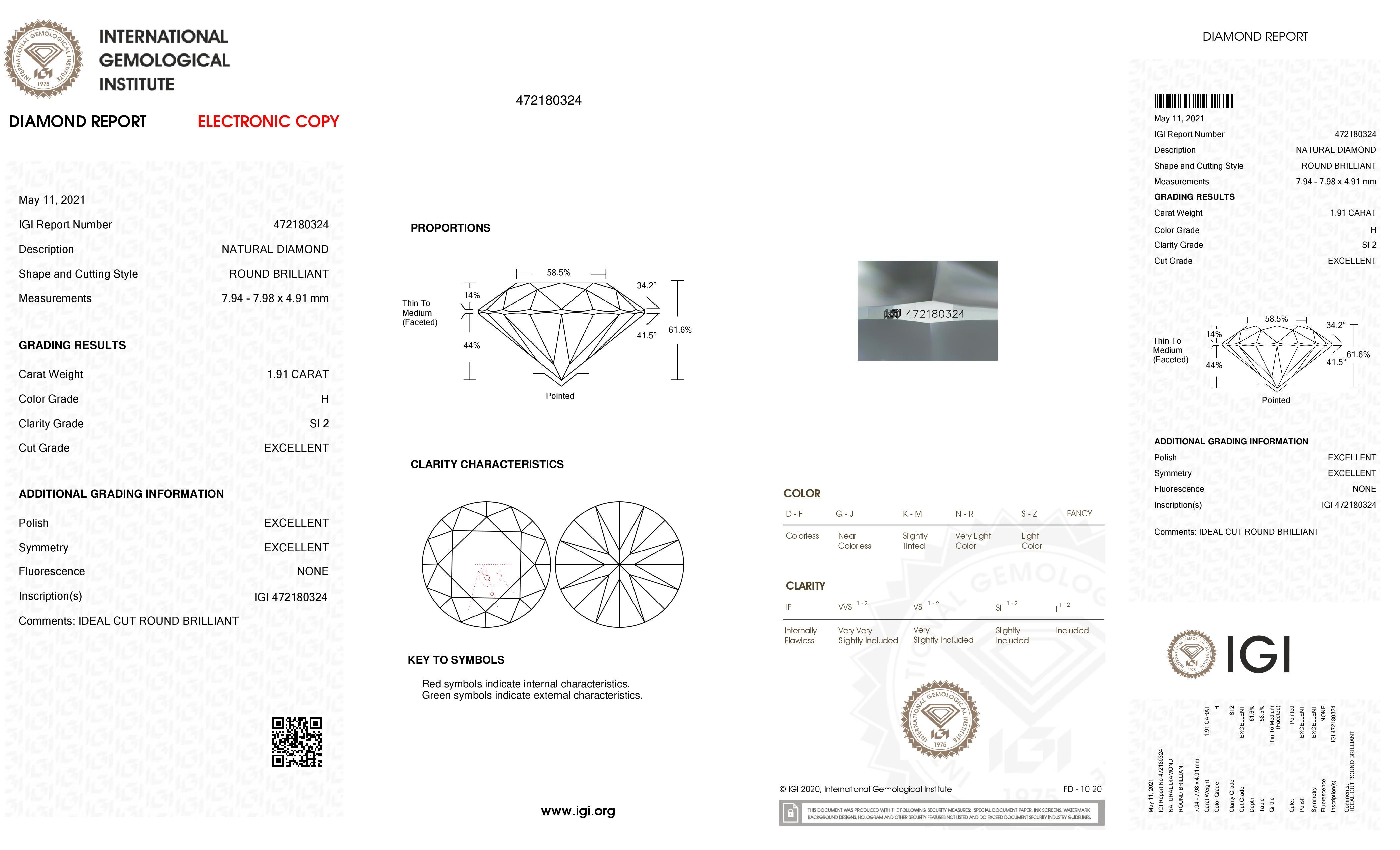 Prírodný diamant okrúhly briliant, SI2, H, 1.91ct, s certifikátom IGI