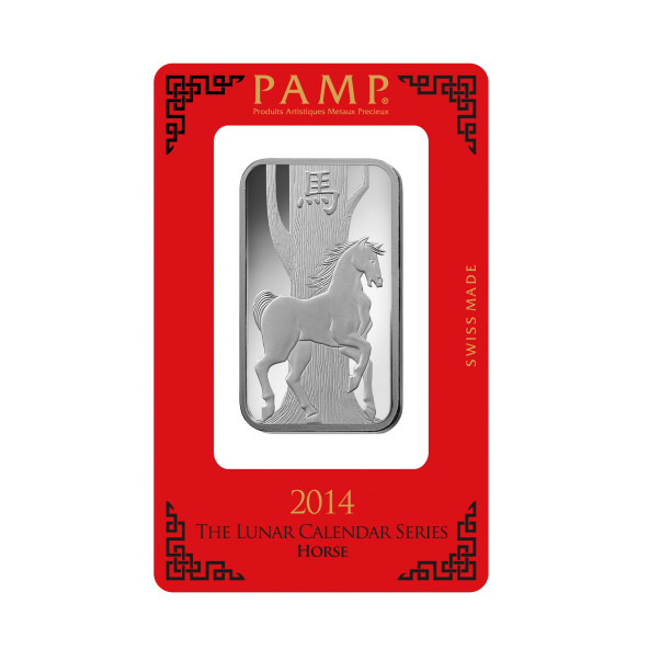 zobrazený reliéf koňa za stromom, podľa činskeho lunárneho kalendara rok koňa, podľa činskeho lunárneho kalendara rok prasaťa, nápis hore "PAMP SISSE", "1OZ silver 999", čislo certifikátu a logo firmy