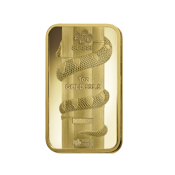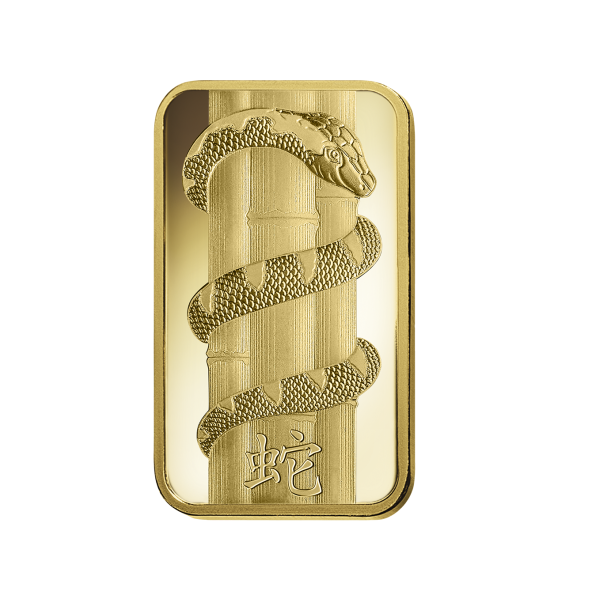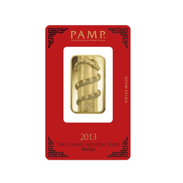 zobrazený reliéf hada, podľa činskeho lunárneho kalendara rok hada, nápis hore "PAMP SISSE", "5g GOLD 999,9", čislo certifikátu a logo firmy