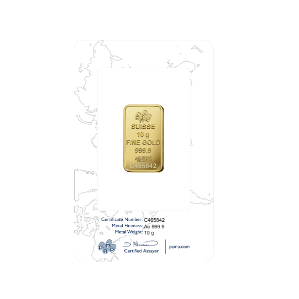 Investičná zlatá tehla 10 g , Pamp Suisse , rýdzosť: 999,9 , razená , Švajčiarsko , blister - zaliate v ochranom plaste , rozmery: 26,5 x 15,8 x 1,25mm ,0% - oslobodené od DPH , LBMA: áno , Garancia výkupu: garantujeme od švajčiarskej firmy Pamp Suisse o hmotnosti 10 g.