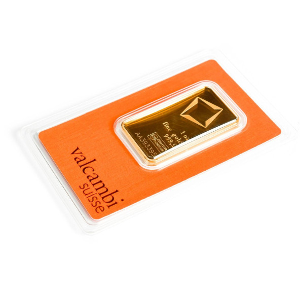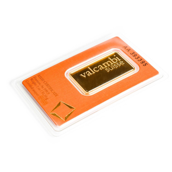 Investičná zlatá tehla 1oz , Valcambi , rýdzosť: 999,9 , razená , Švajčiarsko , blister - zaliate v ochranom plaste , rozmery: 38 x 22 x 2,3mm ,0% - oslobodené od DPH , LBMA: áno , Garancia výkupu: garantujeme od švajčiarskej firmy Valcambi o hmotnosti 1 oz.