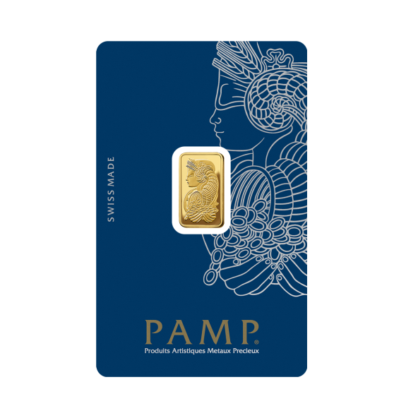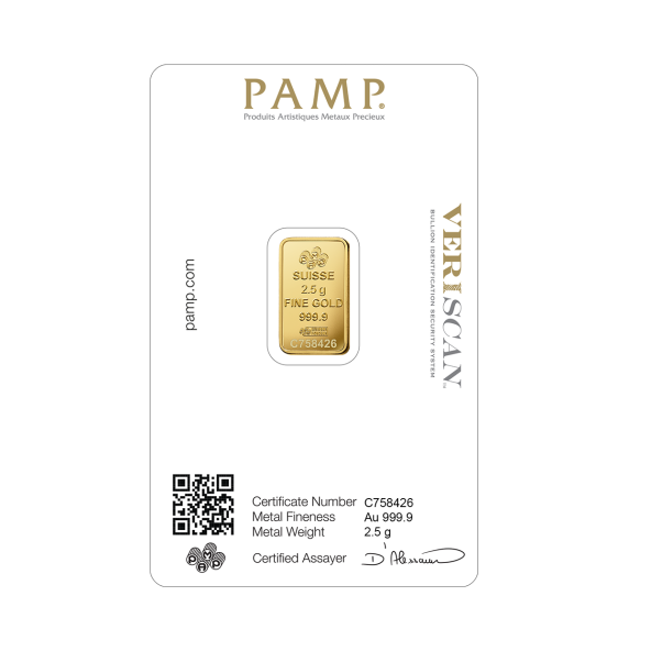 Investičná zlatá tehla 2,5 g , Pamp Suisse , rýdzosť: 999,9 , razená , Švajčiarsko , blister - zaliate v ochranom plaste , rozmery: 19 x 11,5 x 0,6mm ,0% - oslobodené od DPH , LBMA: áno , Garancia výkupu: garantujeme od švajčiarskej firmy Pamp Suisse o hmotnosti 2,5 g.