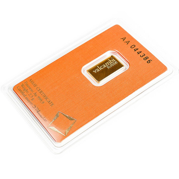 Investičná zlatá tehla 2,5 g , Valcambi , rýdzosť: 999,9 , razená , Švajčiarsko , blister - zaliate v ochranom plaste , rozmery: 19 x 11,5 x 0,8mm ,0% - oslobodené od DPH , LBMA: áno , Garancia výkupu: garantujeme od švajčiarskej firmy Valcambi o hmotnosti 2,5 g.