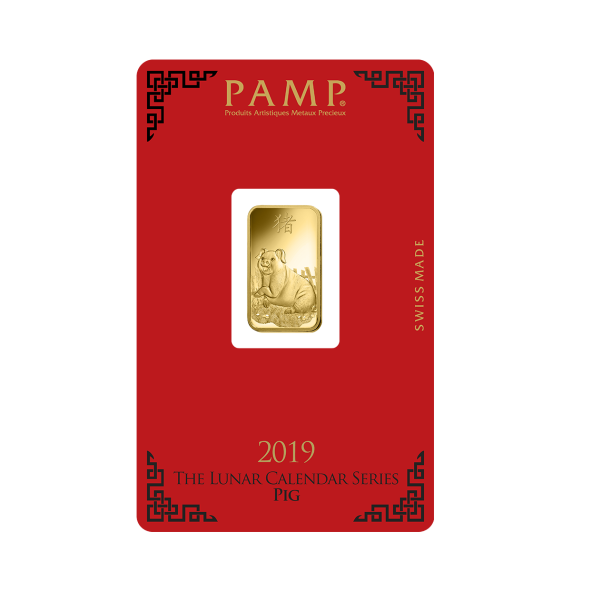 zobrazený reliéf prasaťa chrbtom pri plote a dve male prasiatka s truhlicou zlatých minci, podľa činskeho lunárneho kalendara rok prasaťa, nápis hore "PAMP SISSE", "5g GOLD 999,9", čislo certifikátu a logo firmy