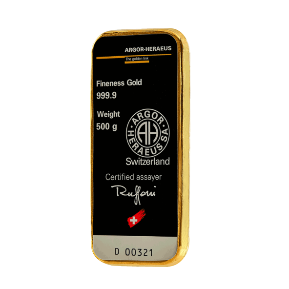 Investičná zlatá tehla 500 g , Argor Heraeus SA , rýdzosť: 999,9 , liata , Švajčiarsko , vakuový obal , rozmery: 91 x 41,5 x 7,5mm ,0% - oslobodené od DPH , LBMA: áno , Garancia výkupu: garantujeme od švajčiarskej firmy Argor Heraeus SA o hmotnosti 500 g.